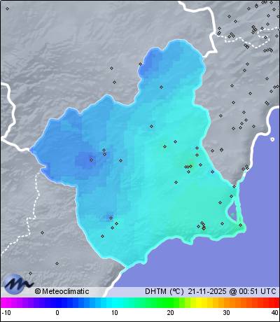 | Dolores (Torre Pacheco) | 40 | 11,3 | 18,3 | 10,9 | 53 | 67 | 35 | 1.016 | 1.017 | 1.011 | 6 NNE | 39 | - | 359,2 | |