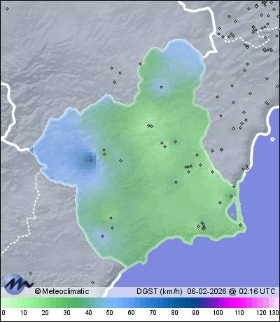 | Dolores (Torre Pacheco) | 40 | 16,3 | 16,8 | 16,0 | 56 | 57 | 53 | 1.000 | 1.000 | 999 | 5 NNW | 17 | - | 67,1 | |