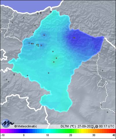 | 26-09-2025 | | | Máx. | Mín. | | | Temperatura | 17,5 | -0,1 | °C | | Humedad | 98 | 49 | % | | Viento | 15 | n/a | km/h | | Presión | 1.023 | 1.020 | hPa | | Precipitación | 0,0 | mm |