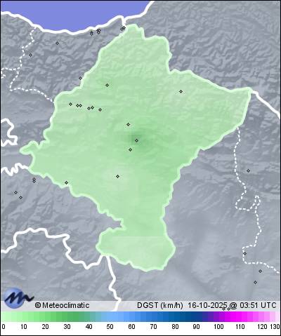 Actualizado: 00:45 UTC | 9,7°C 86% | 9,7 °C / 86% | 9,4°C / 84% | | Calma | 0 km/h | 1.018 hPa |