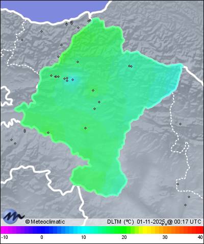 | Act. | Máx. | Mín.  | Act. | Máx. | Mín. | Act. | Máx. | Mín. | Act. | Máx. | Hoy | Año |  |  | Aurizberri-Camping Urrobi | 862 | 14,1 | 15,1 | 5,6 | 70 | 95 | 65 | 1.016 | 1.017 | 1.014 | 18 E | 29 | - | 1.170,0 |  |  |  | Leizego Andiamendi | 1100 | 10,6 | 12,2 | 7,6 | 87 | 95 | 83 | 1.013 | 1.014 | 1.012 | 3 ESE | 16 | 0,4 | 1.169,4 |  |  |  | Lizarragako benta | 1035 | 11,5 | 14,0 | 8,2 | 80 | 97 | 72 | 1.015 | 1.017 | 1.014 | x | x | 0,1 | 348,5 |  |  |  | Miranda de Arga | 310 | 17,7 | 18,9 | 9,7 | 64 | 90 | 61 | 1.014 | 1.016 | 1.012 | 21 SSE | 47 | - | 320,4 |  |  |  | Aurizberri - Espinal | 872 | 14,0 | 14,7 | 9,8 | 72 | 89 | 68 | 1.014 | 1.016 | 1.013 | x | x | - | 1.108,0 |  |  |  | Mendavia | 360 | 17,5 | 21,5 | 10,2 | 64 | 88 | 50 | 1.013 | 1.015 | 1.011 | 2 S | 27 | - | 340,0 |  |  |  | Urdiain | 521 | 16,8 | 19,7 | 11,1 | 61 | 82 | 52 | 1.013 | 1.015 | 1.012 | 4 S | 40 | - | 573,7 |  |  |  | Bakaiku | 532 | 16,5 | 18,0 | 11,2 | 64 | 81 | 53 | 1.013 | 1.015 | 1.011 | 11 ENE | 40 | - | 814,4 |  |  |  | Dorrao | 610 | 16,3 | 17,1 | 11,7 | 71 | 88 | 67 | 1.014 | 1.015 | 1.012 | 34 ESE | 74 | - | 902,4 |  |  |  | Lekunberri | 570 | 16,2 | 16,8 | 11,7 | 72 | 90 | 70 | 1.013 | 1.014 | 1.012 | 13 ESE | 34 | - | 874,4 |  |  |  | Altsasu | 534 | 16,7 | 18,8 | 11,9 | 64 | 79 | 54 | 1.013 | 1.015 | 1.012 | 13 SW | 42 | - | 805,2 |  |  |  | Biurrun | 590 | 15,6 | 17,8 | 12,0 | 66 | 84 | 58 | 1.015 | 1.017 | 1.014 | 26 SSE | 49 | - | 469,4 |  |  |  | Añorbe | 585 | 16,2 | 17,4 | 12,3 | 62 | 81 | 56 | 1.017 | 1.019 | 1.016 | 9 ESE | 39 | - | 524,8 |  |  |  | Lizarraga Ergoiena | 615 | 15,8 | 17,0 | 12,4 | 64 | 78 | 59 | 1.014 | 1.016 | 1.013 | 17 NE | 44 | - | 137,2 |  |  |  | Iturmendi | 523 | 17,2 | 18,2 | 12,7 | 67 | 81 | 59 | 1.013 | 1.015 | 1.012 | 7 ENE | 46 | x | x |  |