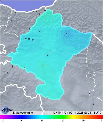 | Actualizado: 03:46 UTC | 9,7°C 75% | 11,9 °C / 79% | | 9,7°C / 75% | | Calma | | 5 km/h | | 1.022 hPa |