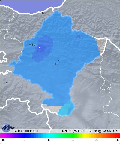 | Actualizado: 02:13 UTC | 3,7°C 95% | 5,1 °C / 95% | | 3,7°C / 91% | | Calma | | 4 km/h | | 1.027 hPa |
