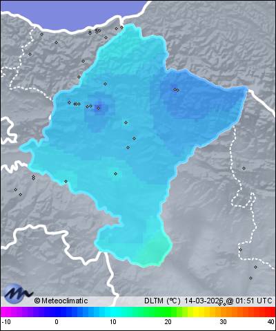| Actualizado: 00:29 UTC | 7,0°C 95% | 7,2 °C / 95% | | 6,8°C / 95% | | 2 km/h W | | 17 km/h | | 1.012 hPa |
