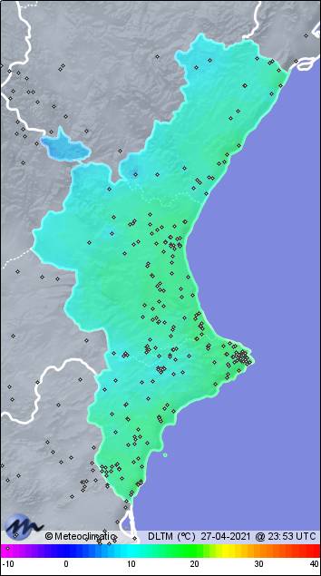 | 27-04-2021 | | | Máx. | Mín. | | | Temperatura | 22,5 | 12,7 | °C | | Humedad | 95 | 59 | % | | Viento | 44 | n/a | km/h | | Presión | 1.010 | 1.007 | hPa | | Precipitación | 4,8 | mm |