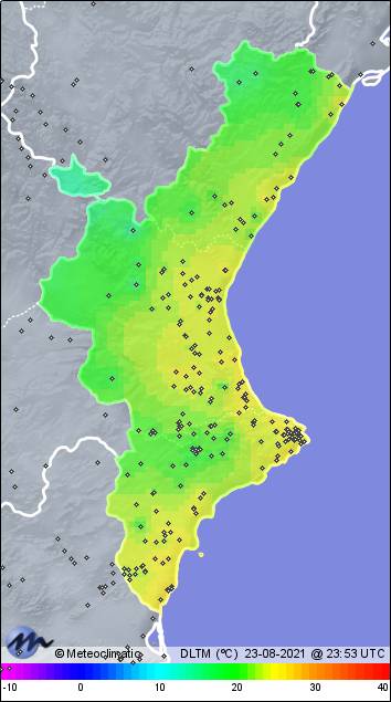 | 23-08-2021 | | | Máx. | Mín. | | | Temperatura | 30,6 | 23,2 | °C | | Humedad | 93 | 62 | % | | Viento | 35 | n/a | km/h | | Presión | 1.022 | 1.018 | hPa | | Precipitación | 0,0 | mm |