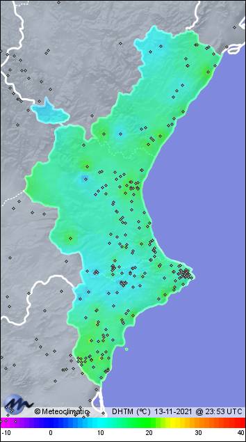 | 13-11-2021 | | | Máx. | Mín. | | | Temperatura | 19,6 | 13,3 | °C | | Humedad | 91 | 61 | % | | Viento | 23 | n/a | km/h | | Presión | 1.019 | 1.016 | hPa | | Precipitación | 0,0 | mm |