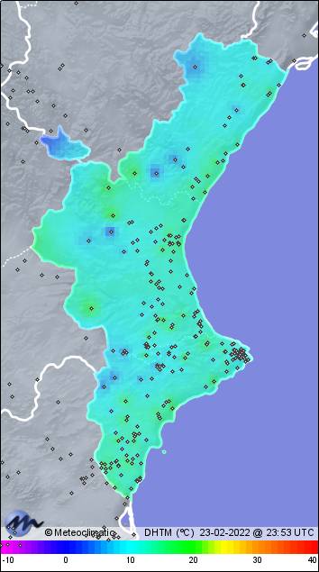 | 23-02-2022 | | | Máx. | Mín. | | | Temperatura | 18,1 | 7,0 | °C | | Humedad | 86 | 37 | % | | Viento | 18 | n/a | km/h | | Presión | 1.024 | 1.019 | hPa | | Precipitación | 0,0 | mm |