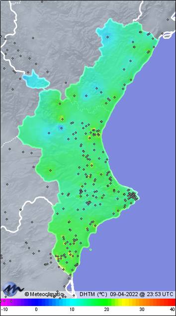| 09-04-2022 | | | Máx. | Mín. | | | Temperatura | 23,1 | 12,6 | °C | | Humedad | 85 | 45 | % | | Viento | 31 | n/a | km/h | | Presión | 1.018 | 1.014 | hPa | | Precipitación | 0,0 | mm |