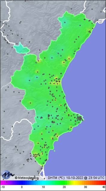 | 10-10-2022 | | | Máx. | Mín. | | | Temperatura | 23,5 | 17,6 | °C | | Humedad | 92 | 75 | % | | Viento | 39 | n/a | km/h | | Presión | 1.019 | 1.016 | hPa | | Precipitación | 32,6 | mm |