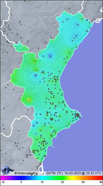 | 16-03-2023 | | | Máx. | Mín. | | | Temperatura | 18,3 | 9,7 | °C | | Humedad | 87 | 55 | % | | Presión | 1.016 | 1.013 | hPa | | Precipitación | 0,0 | mm |
