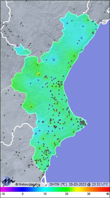 | 20-03-2023 | | | Máx. | Mín. | | | Temperatura | 22,3 | 9,8 | °C | | Humedad | 80 | 44 | % | | Viento | 23 | n/a | km/h | | Presión | 1.024 | 1.017 | hPa | | Precipitación | 0,0 | mm |