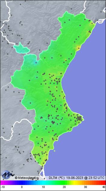 | 19-06-2023 | | | Máx. | Mín. | | | Temperatura | 25,7 | 18,9 | °C | | Humedad | 93 | 66 | % | | Viento | 32 | n/a | km/h | | Presión | 1.013 | 1.010 | hPa | | Precipitación | 0,0 | mm |