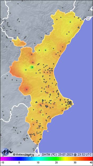 | 23-07-2023 | | | Máx. | Mín. | | | Temperatura | 33,4 | 24,9 | °C | | Humedad | 95 | 55 | % | | Viento | 32 | n/a | km/h | | Presión | 1.018 | 1.010 | hPa | | Precipitación | 0,0 | mm |
