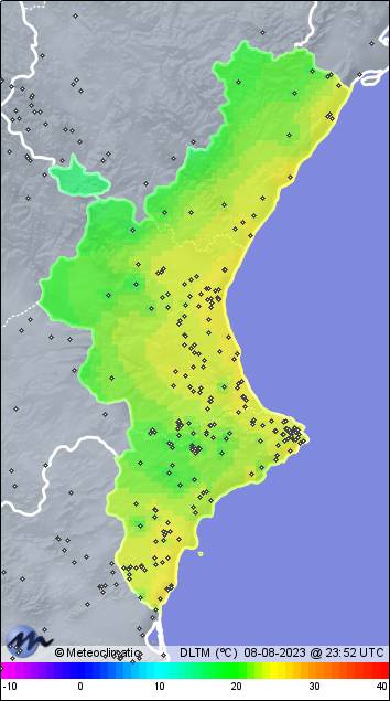 | 08-08-2023 | | | Máx. | Mín. | | | Temperatura | 29,1 | 23,6 | °C | | Humedad | 87 | 67 | % | | Viento | 44 | n/a | km/h | | Presión | 1.019 | 1.016 | hPa | | Precipitación | 0,0 | mm |