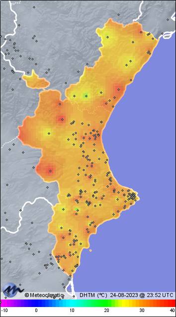 | 24-08-2023 | | | Máx. | Mín. | | | Temperatura | 37,2 | 21,9 | °C | | Humedad | 71 | 31 | % | | Viento | 35 | n/a | km/h | | Presión | 1.018 | 1.015 | hPa | | Precipitación | 0,0 | mm |