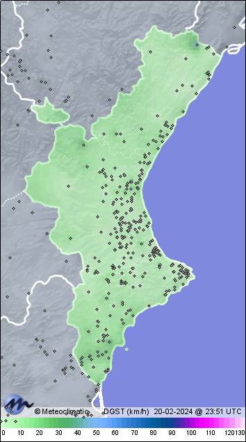 | 20-02-2024 | | | Máx. | Mín. | | | Temperatura | 20,3 | 9,8 | °C | | Humedad | 95 | 33 | % | | Viento | 24 | n/a | km/h | | Presión | 1.031 | 1.026 | hPa | | Precipitación | 0,0 | mm |