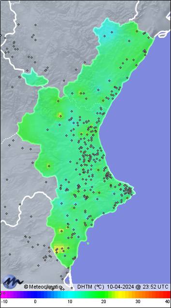 | 10-04-2024 | | | Máx. | Mín. | | | Temperatura | 21,7 | 12,9 | °C | | Humedad | 85 | 26 | % | | Viento | 40 | n/a | km/h | | Presión | 1.030 | 1.024 | hPa | | Precipitación | 0,0 | mm |