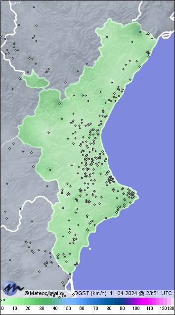 | 11-04-2024 | | | Máx. | Mín. | | | Temperatura | 19,3 | 10,9 | °C | | Humedad | 84 | 55 | % | | Viento | 23 | n/a | km/h | | Presión | 1.032 | 1.025 | hPa | | Precipitación | 0,0 | mm |