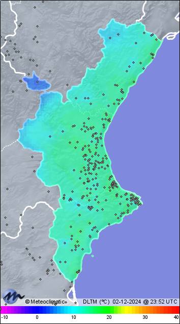 | 02-12-2024 | | | Máx. | Mín. | | | Temperatura | 20,1 | 12,3 | °C | | Humedad | 98 | 59 | % | | Viento | 15 | n/a | km/h | | Presión | 1.025 | 1.021 | hPa | | Precipitación | 0,2 | mm |