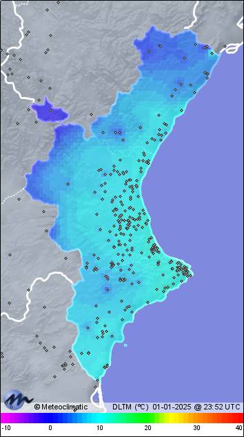 | 01-01-2025 | | | Máx. | Mín. | | | Temperatura | 12,7 | 9,1 | °C | | Humedad | 98 | 89 | % | | Viento | 8 | n/a | km/h | | Presión | 1.034 | 1.031 | hPa | | Precipitación | 23,8 | mm |