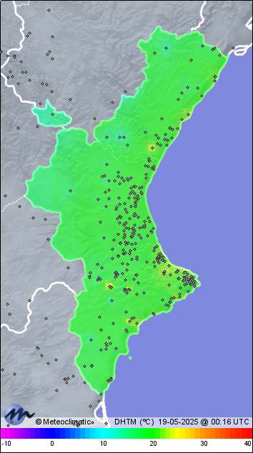 | 18-05-2025 | | | Máx. | Mín. | | | Temperatura | 24,0 | 16,2 | °C | | Humedad | 93 | 60 | % | | Viento | 45 | n/a | km/h | | Presión | 1.018 | 1.014 | hPa | | Precipitación | 0,0 | mm |