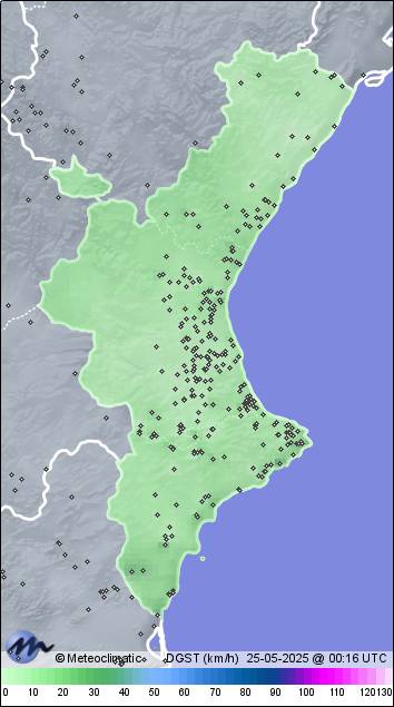 | 24-05-2025 | | | Máx. | Mín. | | | Temperatura | 30,0 | 11,9 | °C | | Humedad | 97 | 37 | % | | Viento | 16 | n/a | km/h | | Presión | 1.020 | 1.017 | hPa | | Precipitación | 0,0 | mm |
