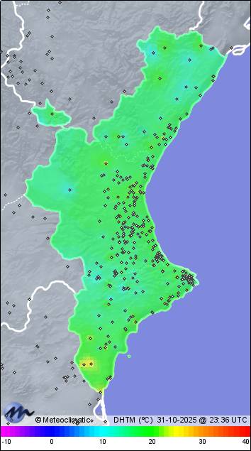 | Act. | Máx.  | Mín. | Act. | Máx. | Mín. | Act. | Máx. | Mín. | Act. | Máx. | Hoy | Año |  |  | Almenara | 26 | 21,9 | 24,6 | 13,7 | 57 | 83 | 51 | 1.014 | 1.016 | 1.013 | 6 SW | 29 | - | 566,2 |  |  |  | Nules | 35 | 20,9 | 24,2 | 13,2 | 79 | 91 | 62 | 1.016 | 1.018 | 1.015 | 3 ENE | 23 | - | 561,4 |  |  |  | Les Alqueries-Lloreta | 20 | 20,4 | 23,9 | 13,1 | 78 | 87 | 60 | 1.014 | 1.016 | 1.013 | 2 ENE | 18 | - | 610,8 |  |  |  | Castelló-Carrer Atzeneta | 43 | 20,2 | 23,7 | 13,1 | 83 | 97 | 60 | 1.015 | 1.017 | 1.014 | 2 SSE | 15 | - | 662,2 |  |  |  | Burriana - la Serratella | 5 | 20,8 | 23,4 | 12,4 | 80 | 95 | 66 | 1.016 | 1.018 | 1.015 | - | 21 | - | 569,2 |  |  |  | Vila-real - Sud | 40 | 21,0 | 23,4 | 14,1 | 72 | 88 | 52 | 1.015 | 1.017 | 1.014 | 5 E | 27 | - | 595,4 |  |  |  | Castelló - Centre Urban | 50 | 20,7 | 23,3 | 12,8 | 72 | 91 | 54 | 1.017 | 1.018 | 1.015 | 2 ENE | 18 | - | 590,2 |  |  |  | Castelló - Palau Festa | 25 | 20,2 | 23,2 | 14,9 | 84 | 90 | 67 | 1.015 | 1.017 | 1.014 | 5 E | 23 | - | 553,2 |  |  |  | La Vall d'Uixó | 130 | 21,1 | 23,2 | 13,4 | 63 | 90 | 57 | 1.015 | 1.017 | 1.014 | - | 13 | - | 596,8 |  |  |  | Segorbe | 170 | 19,2 | 23,0 | 10,3 | 64 | 89 | 53 | 1.015 | 1.017 | 1.015 | 3 WSW | 19 | - | 566,8 |  |  |  | Betxí | 102 | 21,0 | 22,9 | 14,1 | 75 | 86 | 60 | 1.015 | 1.016 | 1.014 | 2 E | 19 | - | 650,6 |  |  |  | Betxí - Muntanyeta | 50 | 20,1 | 22,9 | 14,4 | 76 | 80 | 60 | 1.014 | 1.015 | 1.013 | 6 E | 26 | - | 598,6 |  |  |  | Burriana | 20 | 20,4 | 22,9 | 14,1 | 84 | 91 | 66 | 1.015 | 1.016 | 1.014 | 2 ENE | 19 | - | 622,8 |  |  |  | Castelló - Tetuán 14 | 50 | 20,4 | 22,9 | 13,9 | 84 | 95 | 70 | 1.015 | 1.017 | 1.014 | - | 23 | - | 514,8 |  |  |  | Sant Joan de Moró | 180 | 20,3 | 22,8 | 11,6 | 73 | 93 | 60 | 1.018 | 1.019 | 1.017 | - | 21 | - | 462,2 |  |  |  | Peníscola - Centro | 12 | 20,4 | 22,5 | 15,4 | 84 | 92 | 75 | 1.014 | 1.016 | 1.013 | - | 11 | - | 332,4 |  |  |  | Jérica Media Vega | 482 | 18,3 | 22,3 | 9,4 | 56 | 88 | 45 | 1.015 | 1.018 | 1.014 | - | 11 | - | 567,1 |  |  |  | Peñíscola - Gran Hotel | 19 | 20,6 | 22,3 | 13,3 | 81 | 89 | 74 | 1.013 | 1.014 | 1.011 | 2 ESE | 18 | - | 409,6 |  |  |  | Burriana - Santa Bárbara | 10 | 19,7 | 22,2 | 12,6 | 85 | 96 | 63 | 1.014 | 1.015 | 1.013 | 5 NE | 19 | - | 591,2 |  |  |  | Tales | 232 | 19,4 | 22,2 | 11,6 | 74 | 89 | 55 | 1.014 | 1.015 | 1.013 | - | 18 | - | 749,4 |  |  |  | Alcalà de Xivert | 170 | 19,3 | 22,1 | 12,4 | 82 | 94 | 70 | 1.017 | 1.018 | 1.015 | - | 21 | - | 462,0 |  |  |  | Castelló - Planetari | 5 | 20,6 | 21,9 | 13,5 | 82 | 93 | 75 | 1.015 | 1.016 | 1.014 | 10 E | 18 | - | 683,2 |  |  |  | Benicàssim - Aj. | 15 | 21,3 | 21,8 | 16,1 | 72 | 88 | 66 | 1.015 | 1.016 | 1.013 | - | 19 | - | 533,0 |  |  |  | Jérica-Los Novales | 435 | 17,6 | 21,8 | 5,9 | 76 | 99 | 56 | 1.015 | 1.017 | 1.014 | - | 11 | 0,2 | 559,8 |  |  |  | Les Coves de Vinromà | 190 | 19,5 | 21,8 | 9,1 | 78 | 95 | 60 | 1.017 | 1.018 | 1.016 | - | 16 | - | 548,0 |  |  |  | Castelló - PortCastelló S | 5 | 20,7 | 21,7 | 13,4 | 84 | 95 | 77 | 1.015 | 1.016 | 1.014 | 8 ENE | 16 | - | 564,0 |  |  |  | Benlloch | 320 | 18,9 | 21,5 | 10,1 | 74 | 99 | 60 | 1.013 | 1.014 | 1.011 | - | 13 | - | 546,0 |  |  |  | Alcossebre | 10 | 20,2 | 21,4 | 13,5 | 84 | 95 | 81 | 1.017 | 1.018 | 1.015 | - | 15 | - | 428,2 |  |  |  | Oropesa del Mar | 25 | 20,1 | 20,9 | 16,1 | 80 | 85 | 64 | 1.014 | 1.015 | 1.013 | x | x | - | 560,0 |  |  |  | Peníscola - Penismar | 11 | 20,1 | 20,7 | 14,4 | 83 | 91 | 76 | 1.016 | 1.017 | 1.014 | 2 S | 15 | - | 360,6 |  |  |  | Xert / Chert | 450 | 17,1 | 20,3 | 9,9 | 75 | 91 | 57 | 1.015 | 1.016 | 1.013 | 3 WNW | 18 | - | 647,2 |  |  |  | Benassal | 828 | 15,0 | 20,0 | 15,0 | 81 | 81 | 61 | 1.016 | 1.016 | 1.015 | - | 7 | - | 329,6 |  |  |  | Morella - Ant.Fonda Elías | 980 | 13,9 | 20,0 | 9,1 | 81 | 91 | 53 | 1.016 | 1.017 | 1.014 | 4 ENE | 11 | - | 540,3 |  |  |  | Bejís | 780 | 16,1 | 19,6 | 10,3 | 62 | 83 | 53 | 1.014 | 1.015 | 1.012 | 3 NNW | 31 | - | 589,6 |  |  |  | Cinctorres | 907 | 16,1 | 18,5 | 7,2 | 74 | 90 | 58 | 1.013 | 1.015 | 1.013 | 3 ENE | 16 | - | 502,4 |  |  |  | Morella | 980 | 14,7 | 18,4 | 9,6 | 81 | 91 | 60 | 1.014 | 1.016 | 1.013 | 5 ENE | 16 | 0,2 | 580,2 |  |