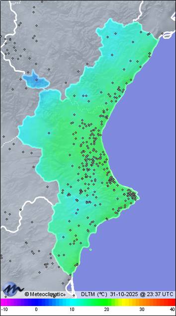 | Act. | Máx. | Mín.  | Act. | Máx. | Mín. | Act. | Máx. | Mín. | Act. | Máx. | Hoy | Año |  |  | Torrebaja | 740 | 15,4 | 18,2 | 4,9 | 65 | 95 | 57 | 1.017 | 1.020 | 1.016 | 2 SSE | 18 | 0,2 | 88,2 |  |  |  | Fontanars - Gasolinera | 625 | 18,4 | 21,4 | 9,1 | 64 | 92 | 54 | 1.017 | 1.018 | 1.015 | 10 WNW | 23 | - | 430,8 |  |  |  | Requena | 725 | 15,7 | 16,7 | 9,1 | 72 | 97 | 68 | 1.015 | 1.016 | 1.014 | 10 WSW | 32 | 0,2 | 348,4 |  |  |  | Fontanars - Oeste | 628 | 18,1 | 20,8 | 9,9 | 62 | 90 | 53 | 1.016 | 1.017 | 1.015 | 12 W | 28 | - | 464,6 |  |  |  | Fontanars dels Alforins | 635 | 18,4 | 21,7 | 10,1 | 61 | 91 | 52 | 1.017 | 1.018 | 1.016 | 6 WSW | 19 | - | 394,6 |  |  |  | Pedralba | 160 | 20,7 | 23,3 | 10,2 | 58 | 92 | 54 | 1.017 | 1.018 | 1.016 | 3 WNW | 19 | - | 446,2 |  |  |  | Quesa - EcoCampingQuesa | 270 | 19,2 | 23,4 | 10,2 | 67 | 96 | 51 | 1.016 | 1.017 | 1.015 | 2 SSW | 15 | - | 706,6 |  |  |  | Barxeta | 120 | 21,3 | 24,9 | 11,2 | 74 | 96 | 57 | 1.017 | 1.018 | 1.016 | 6 SE | 23 | - | 809,6 |  |  |  | Ontinyent - Llombo | 385 | 21,3 | 23,3 | 11,3 | 59 | 89 | 53 | 1.016 | 1.018 | 1.015 | 3 WSW | 21 | - | 695,4 |  |  |  | Moixent | 345 | 21,3 | 23,7 | 11,4 | 55 | 84 | 49 | 1.017 | 1.019 | 1.016 | 5 SSW | 26 | - | 645,2 |  |  |  | Ontinyent - Alt de Toledo | 400 | 20,8 | 23,1 | 11,4 | 61 | 80 | 53 | 1.017 | 1.018 | 1.016 | - | 8 | - | 754,4 |  |  |  | Ontinyent - sta. Anna N | 383 | 20,9 | 22,8 | 11,6 | 61 | 89 | 55 | 1.017 | 1.018 | 1.016 | 3 SW | 19 | - | 677,0 |  |  |  | Benigànim | 185 | 21,8 | 24,4 | 11,7 | 70 | 96 | 58 | 1.016 | 1.018 | 1.016 | 2 N | 19 | - | 606,4 |  |  |  | Llíria | 180 | 20,4 | 22,7 | 11,8 | 65 | 90 | 59 | 1.016 | 1.017 | 1.015 | 8 W | 29 | - | 543,2 |  |  |  | Ontinyent - Alba | 405 | 20,9 | 23,8 | 11,8 | 67 | 91 | 55 | 1.016 | 1.017 | 1.015 | 2 SW | 21 | - | 713,6 |  |  |  | L'Alcúdia - Carriona | 45 | 22,3 | 24,9 | 11,9 | 64 | 95 | 58 | 1.016 | 1.018 | 1.015 | x | x | - | 460,8 |  |  |  | Turís - Greenval | 235 | 20,0 | 21,6 | 11,9 | 68 | 95 | 65 | 1.017 | 1.018 | 1.015 | 10 WNW | 37 | - | 555,8 |  |  |  | Gilet | 95 | 21,6 | 23,8 | 12,1 | 66 | 91 | 59 | 1.017 | 1.018 | 1.016 | 15 WSW | 32 | - | 507,4 |  |  |  | Ontinyent | 372 | 21,8 | 23,9 | 12,1 | 58 | 88 | 53 | 1.017 | 1.018 | 1.016 | 2 WSW | 16 | - | 718,0 |  |  |  | Ontinyent - IES Jaume I | 372 | 21,8 | 23,9 | 12,1 | 58 | 88 | 53 | 1.017 | 1.018 | 1.016 | 2 WSW | 16 | - | 718,0 |  |  |  | Anna | 220 | 21,3 | 24,8 | 12,2 | 68 | 94 | 57 | 1.016 | 1.017 | 1.015 | 2 NW | 13 | - | 853,0 |  |  |  | Alfarrasí | 210 | 21,7 | 24,2 | 12,3 | 72 | 93 | 57 | 1.018 | 1.019 | 1.017 | 2 N | 21 | - | 694,8 |  |  |  | Almiserà | 169 | 20,9 | 24,8 | 12,3 | 73 | 91 | 56 | 1.017 | 1.019 | 1.016 | - | 13 | - | 805,8 |  |  |  | Enova - Riu Rau | 50 | 22,6 | 29,1 | 12,3 | 32 | 61 | 19 | 1.008 | 1.010 | 1.007 | - | 0 | - | 352,8 |  |  |  | Font de la Fig. - Poble | 555 | 19,1 | 21,4 | 12,3 | 60 | 84 | 54 | 1.015 | 1.016 | 1.014 | 11 WNW | 27 | - | 355,2 |  |  |  | Guadassuar - Cooperativa | 23 | 22,8 | 25,4 | 12,3 | 65 | 95 | 57 | 1.019 | 1.020 | 1.018 | 2 WNW | 19 | - | 491,6 |  |  |  | Moixent - Cumbres | 740 | 17,1 | 19,3 | 12,3 | 71 | 86 | 64 | 1.017 | 1.019 | 1.016 | 10 WNW | 31 | - | 700,6 |  |  |  | Quatretonda sud-est | 216 | 21,4 | 23,8 | 12,3 | 64 | 87 | 50 | 1.016 | 1.018 | 1.016 | 5 N | 19 | - | 693,8 |  |  |  | Sagunt - Casc Urbà | 60 | 22,1 | 23,9 | 12,3 | 62 | 91 | 58 | 1.016 | 1.017 | 1.015 | 13 SSW | 34 | - | 517,0 |  |  |  | Buñol - C.Cid | 365 | 19,1 | 20,7 | 12,4 | 61 | 88 | 56 | 1.017 | 1.018 | 1.016 | 2 SW | 24 | - | 679,6 |  |  |  | Massalavés | 35 | 23,1 | 25,6 | 12,4 | 61 | 93 | 58 | 1.017 | 1.019 | 1.017 | 2 WNW | 13 | - | 499,6 |  |  |  | Senyera | 50 | 23,6 | 25,8 | 12,4 | 58 | 91 | 52 | 1.018 | 1.020 | 1.017 | 2 NW | 13 | - | 574,6 |  |  |  | Castelló | 45 | 23,2 | 25,9 | 12,5 | 56 | 88 | 48 | 1.017 | 1.019 | 1.016 | 5 N | 15 | - | 622,6 |  |  |  | Benimodo | 42 | 21,3 | 24,3 | 12,6 | 69 | 96 | 61 | 1.015 | 1.017 | 1.015 | 10 NW | 26 | - | 467,4 |  |  |  | Càrcer | 46 | 22,9 | 25,6 | 12,6 | 61 | 89 | 51 | 1.017 | 1.019 | 1.016 | 3 WNW | 18 | - | 639,4 |  |  |  | Alberic - Sud | 26 | 22,9 | 24,8 | 12,7 | 57 | 91 | 52 | 1.017 | 1.019 | 1.017 | 5 WNW | 19 | - | 594,0 |  |  |  | Alzira - La Casella | 110 | 20,7 | 24,3 | 12,7 | 75 | 91 | 56 | 1.016 | 1.018 | 1.015 | 3 SE | 19 | - | 1.069,4 |  |  |  | Càrcer - CEIP PareGumilla | 35 | 23,0 | 26,2 | 12,7 | 62 | 89 | 52 | 1.017 | 1.018 | 1.016 | 3 WNW | 10 | - | 717,0 |  |  |  | Quatretonda | 230 | 21,3 | 24,1 | 12,7 | 69 | 88 | 54 | 1.012 | 1.014 | 1.011 | 10 NNE | 23 | - | 668,4 |  |  |  | Benaguasil - EME | 120 | 21,1 | 23,6 | 12,8 | 60 | 89 | 55 | 1.017 | 1.019 | 1.016 | 4 W | 18 | - | 440,7 |  |  |  | El Genovés - SW | 145 | 21,9 | 24,7 | 12,8 | 64 | 83 | 51 | 1.016 | 1.018 | 1.016 | - | 21 | - | 533,6 |  |  |  | Pedralba - Serretilla | 235 | 21,3 | 23,0 | 12,8 | 60 | 89 | 57 | 1.018 | 1.019 | 1.017 | 6 W | 26 | - | 563,8 |  |  |  | Benimodo - Nord | 47 | 21,9 | 24,3 | 12,9 | 62 | 81 | 55 | 1.018 | 1.020 | 1.017 | 13 NNW | 27 | - | 346,4 |  |  |  | Bétera - Conarda | 150 | 20,8 | 23,4 | 12,9 | 59 | 89 | 56 | 1.016 | 1.017 | 1.015 | - | 0 | - | 435,4 |  |  |  | casinos | 299 | 19,4 | 23,5 | 12,9 | 55 | 84 | 46 | 1.016 | 1.017 | 1.014 | 7 NNW | 22 | - | 446,3 |  |  |  | L'Eliana | 92 | 21,6 | 23,4 | 12,9 | 55 | 88 | 54 | 1.016 | 1.017 | 1.015 | 5 WNW | 21 | - | 424,2 |  |  |  | Millares | 360 | 19,6 | 21,5 | 12,9 | 68 | 90 | 62 | 1.017 | 1.017 | 1.016 | - | 23 | 0,2 | 545,2 |  |  |  | Sant Joanet | 40 | 22,8 | 25,3 | 12,9 | 66 | 91 | 55 | 1.017 | 1.019 | 1.016 | 5 N | 18 | - | 552,8 |  |  |  | Vilamarxant - Aj. | 110 | 21,2 | 23,2 | 12,9 | 61 | 90 | 59 | 1.015 | 1.017 | 1.014 | 8 SW | 32 | - | 485,0 |  |  |  | Carlet Caseta del Banc | 95 | 20,9 | 23,2 | 13,0 | 71 | 91 | 68 | 1.014 | 1.015 | 1.013 | 7 NW | 20 | - | 480,8 |  |  |  | L'Alcúdia | 40 | 22,3 | 24,8 | 13,1 | 69 |
