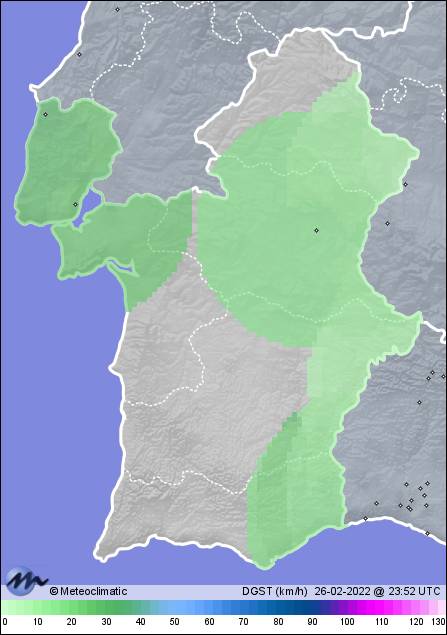 | 26-02-2022 | | | Máx. | Mín. | | | Temperatura | 18,2 | 10,3 | °C | | Humedad | 92 | 68 | % | | Viento | 31 | n/a | km/h | | Presión | 1.021 | 1.017 | hPa | | Precipitación | 0,0 | mm |