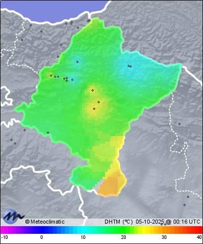 | 04-10-2025 | | | Máx. | Mín. | | | Temperatura | 19,8 | 7,0 | °C | | Humedad | 98 | 72 | % | | Viento | 19 | n/a | km/h | | Presión | 1.025 | 1.021 | hPa | | Precipitación | 2,0 | mm |