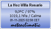 |  | Máx. | Mín. |  |  | Máx. | Mín. |  |  | Máx. |  |  | Máx. | Mín. |  |  | Máx. |  |  | Total |  | Hoy | 23.7 | 13.7 |  | Hoy | 93 | 43 |  | Hoy | 13 |  | Hoy | 1019 | 1017 |  | Hoy |  |  | Hoy | 0.0 |  | Mes | 23.7 | 13.7 |  | Mes | 93 | 43 |  | Mes | 13 |  | Mes | 1019 | 1017 |  | Mes |  |  | Mes | 27.4 |  | Año | 23.7 | 13.7 |  | Año | 93 | 43 |  | Año | 13 |  | Año | 1019 | 1017 |  | Año |  |  | Año | 35.5 |  |  |